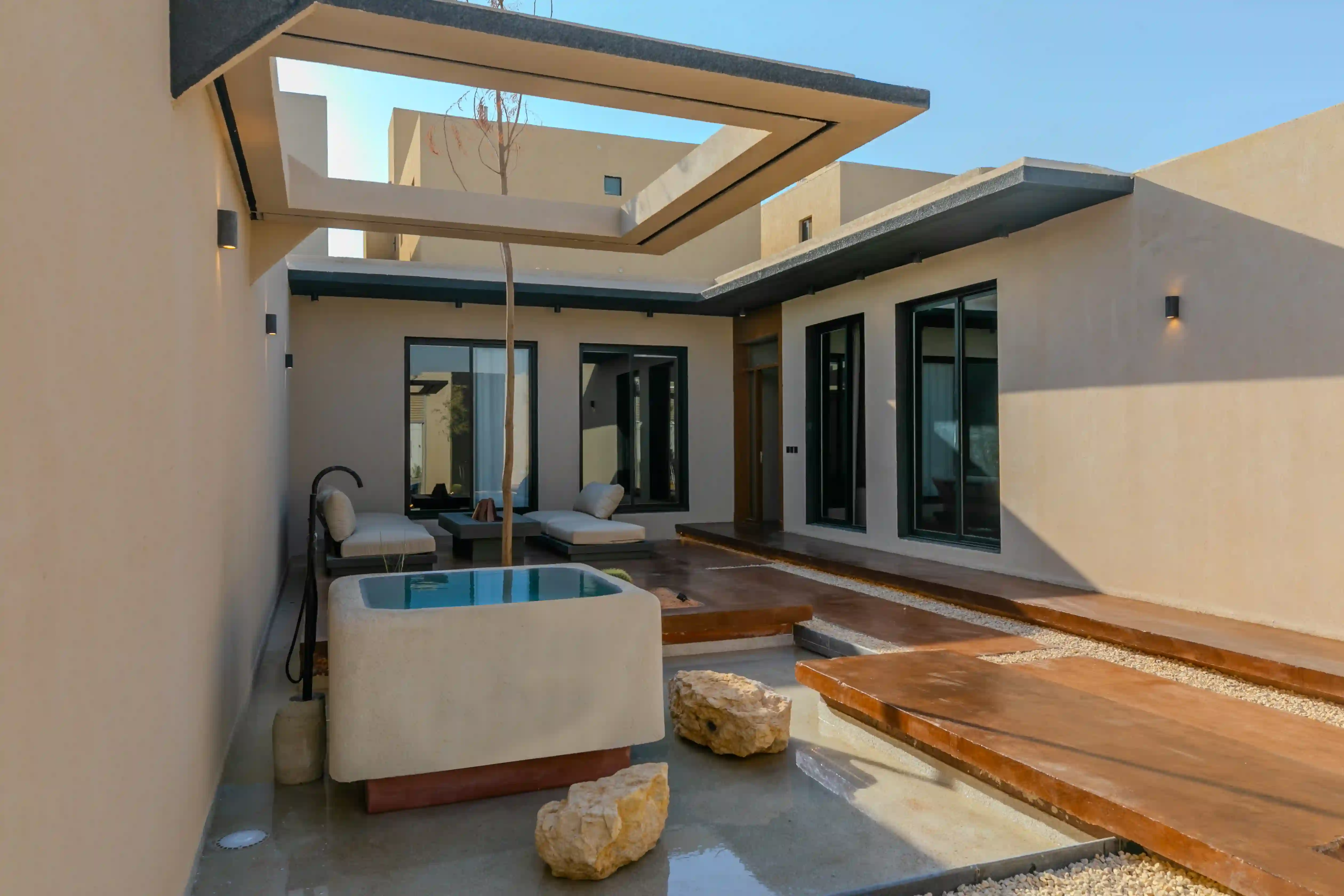 Welcome to a bold yet tranquil escape—an architectural dialogue between brutalism, minimalism, and the raw beauty of Saudi nature. Designed to honor the quiet power of the desert, this guesthouse is a sanctuary of simplicity and serenity.